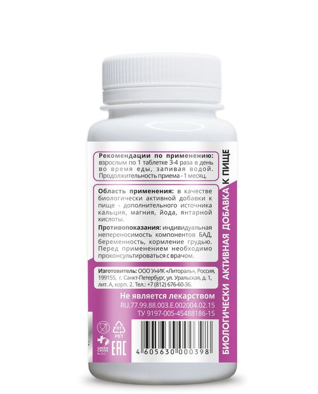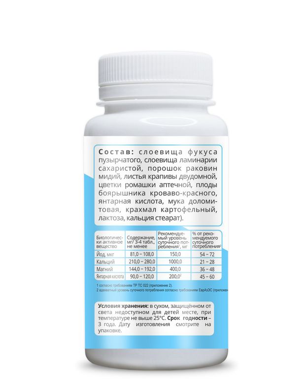 Состав: Слоевища фукуса пузырчатого, слоевища ламинарии сахаристой, порошок раковин мидий, листья крапивы двудомной, цветки ромашки аптечной, плоды боярышника кроваво-красного, янтарная кислота, мука доломитовая, крахмал картофельный, лактоза, кальция стеарат.